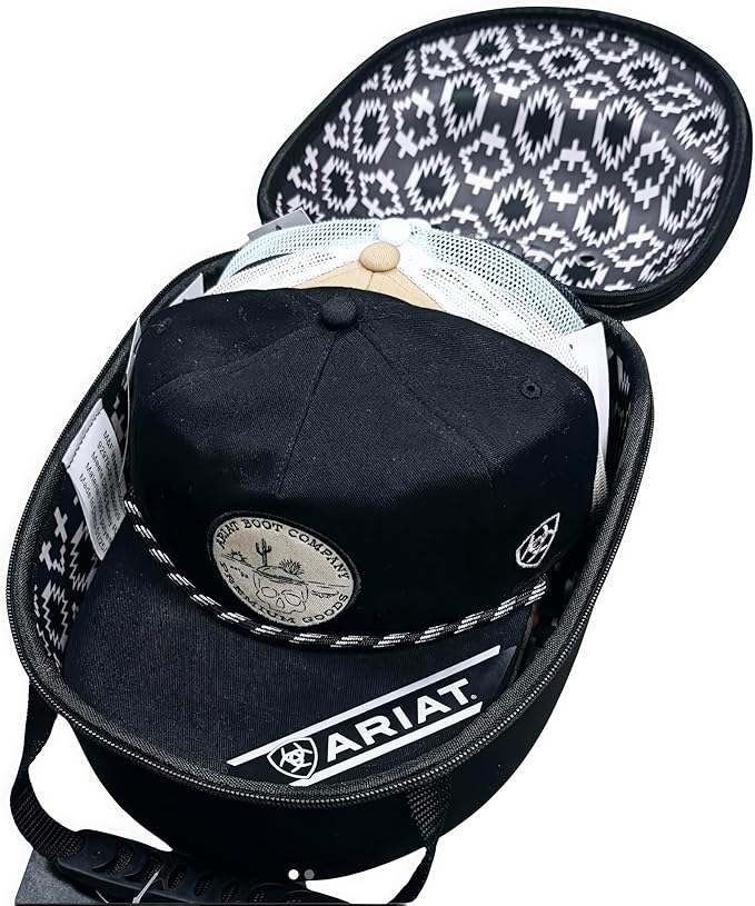 This black spandex cap case will hold 4 to 6 caps. Easy to carry with black nylon and rubber handle. Black, white, and grey southwest fabric on the inside. 2 zipper closure.