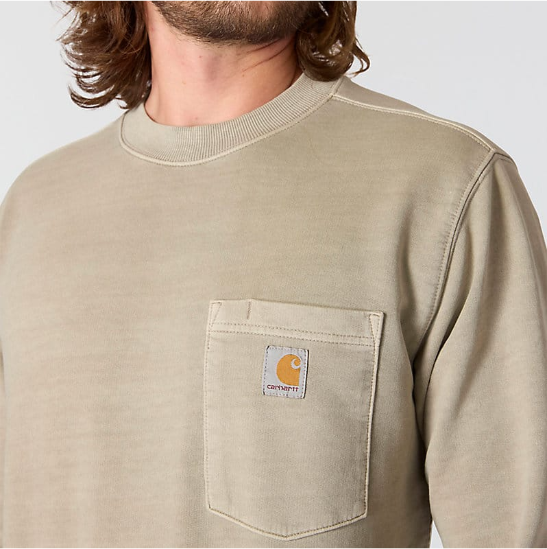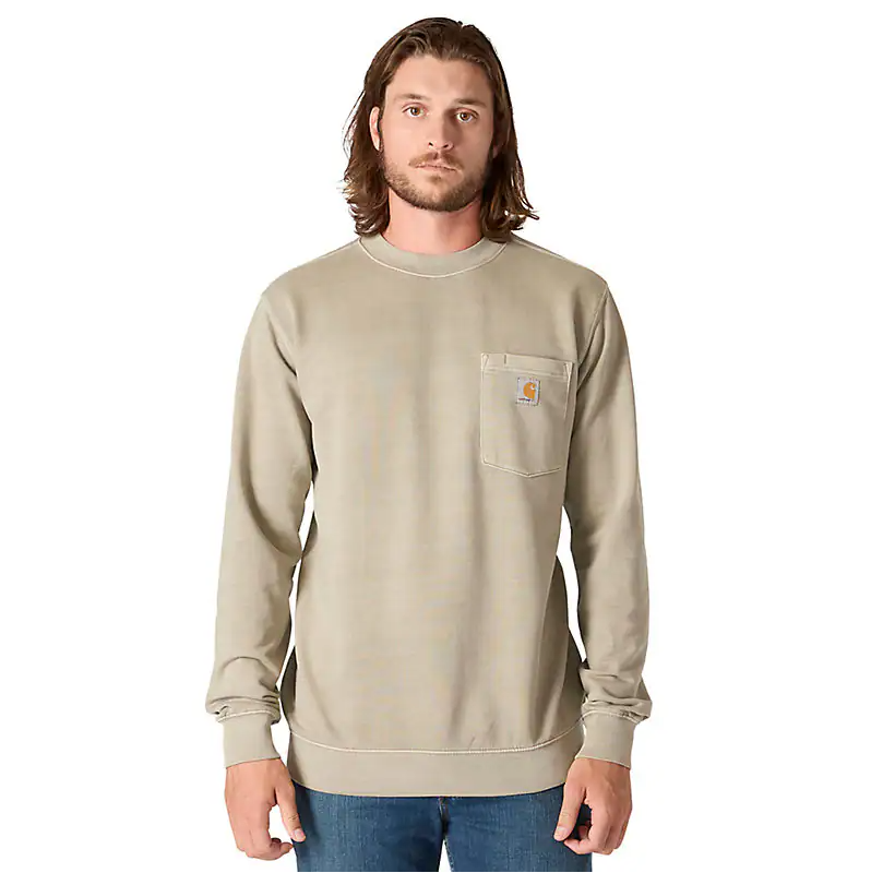 This men's French terry crewneck sweatshirt is garment-dyed for a worn-in, vintage look that only gets better with time. Built to last from midweight all-cotton French terry with a relaxed fit. Featuring a Carhartt label on the chest pocket.