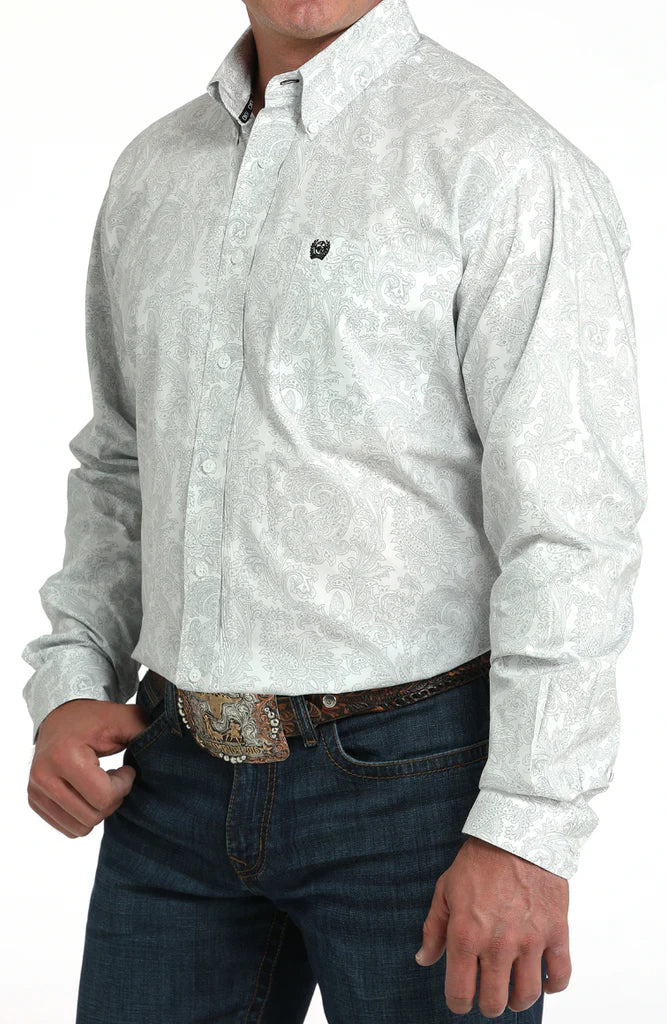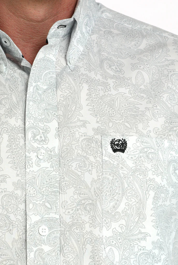 This handsome shirt features a white and grey paisley print, an open left front pocket, an embroidered logo, and matching buttons.
