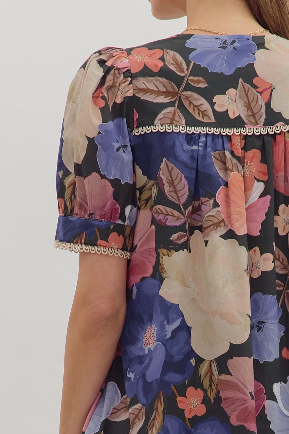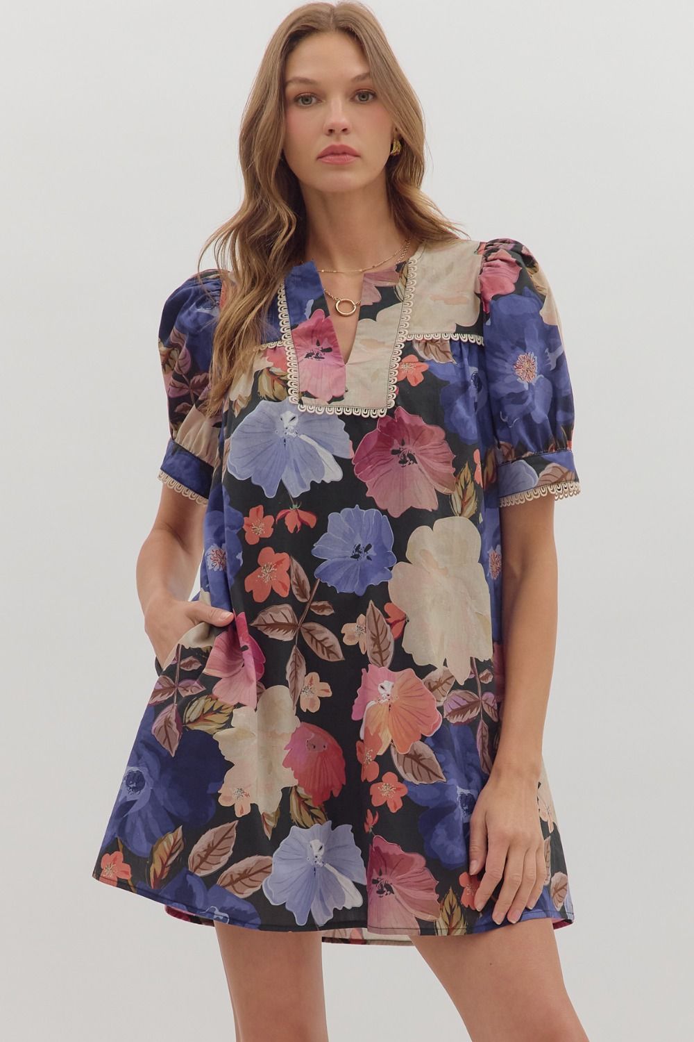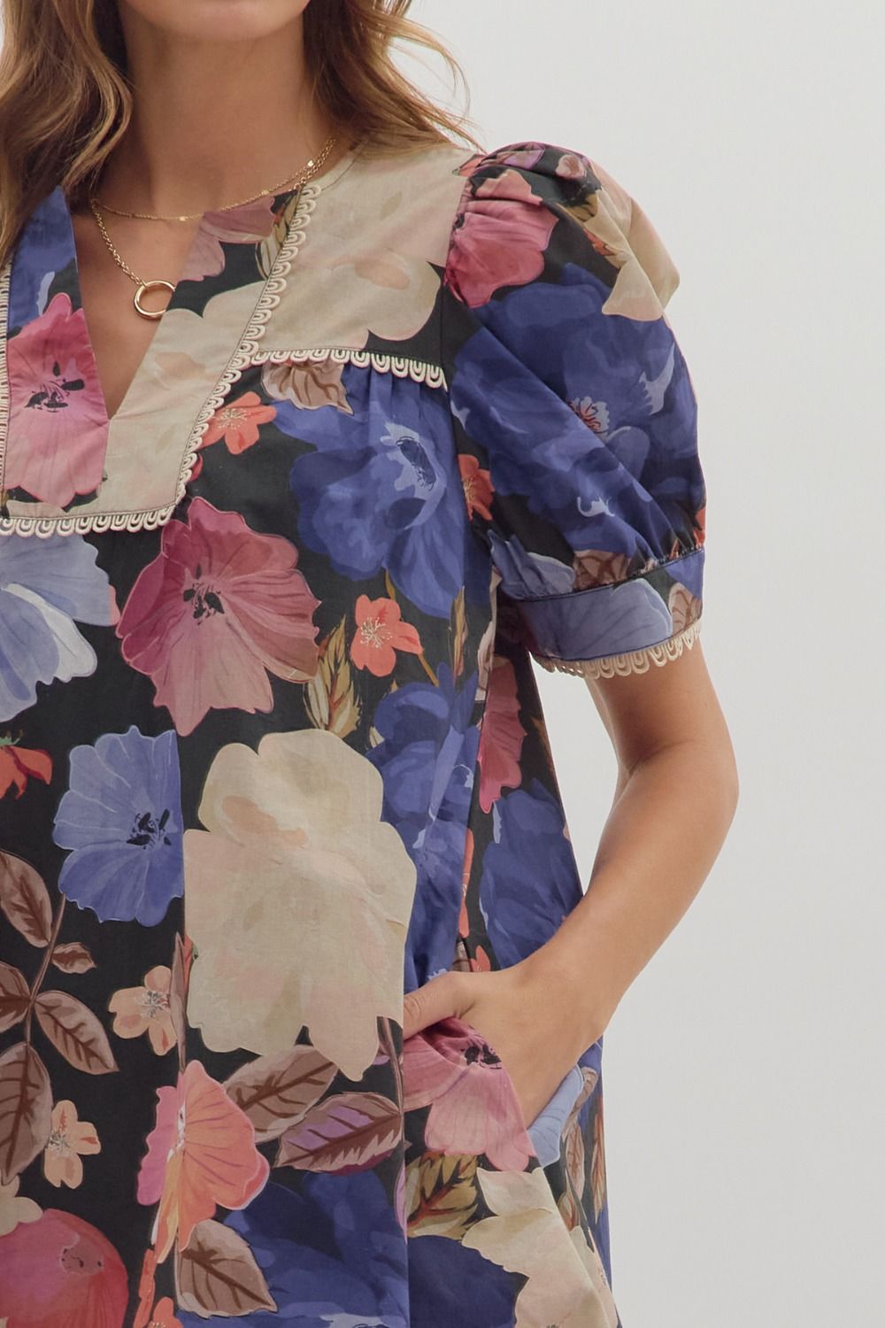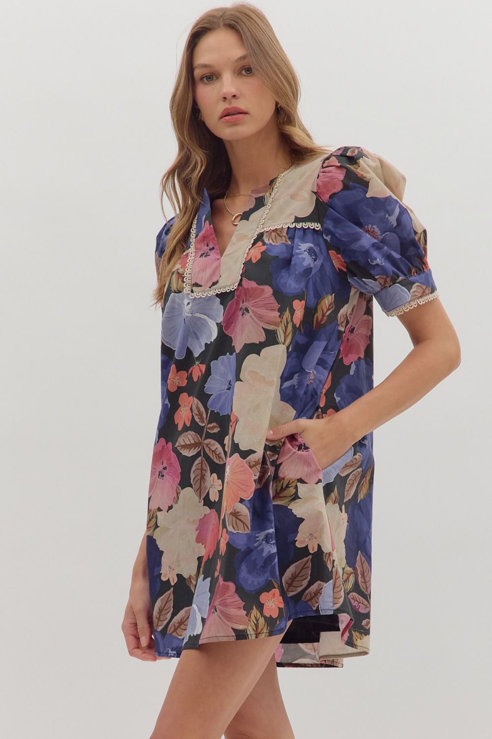 Floral print puff sleeve mini dress featuring scallop accent trim at neckline, sleeve, and yoke. Side pockets. Lined. Woven. Non-sheer. Lightweight.