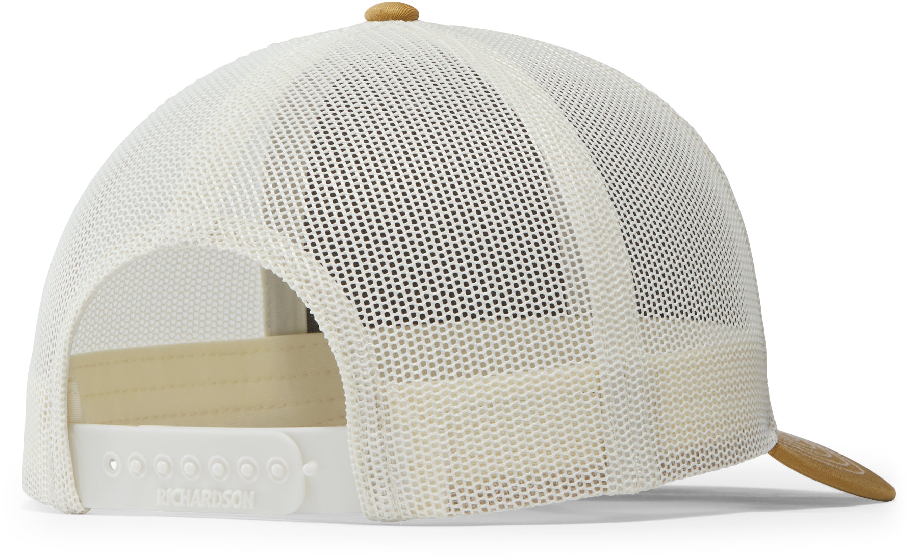 This five-panel hat features breathable mesh back panels, adjustable snapback closure, and a woven patch.