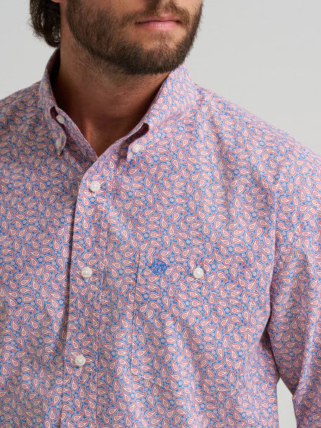 Red, white, and blue paisley print throughout