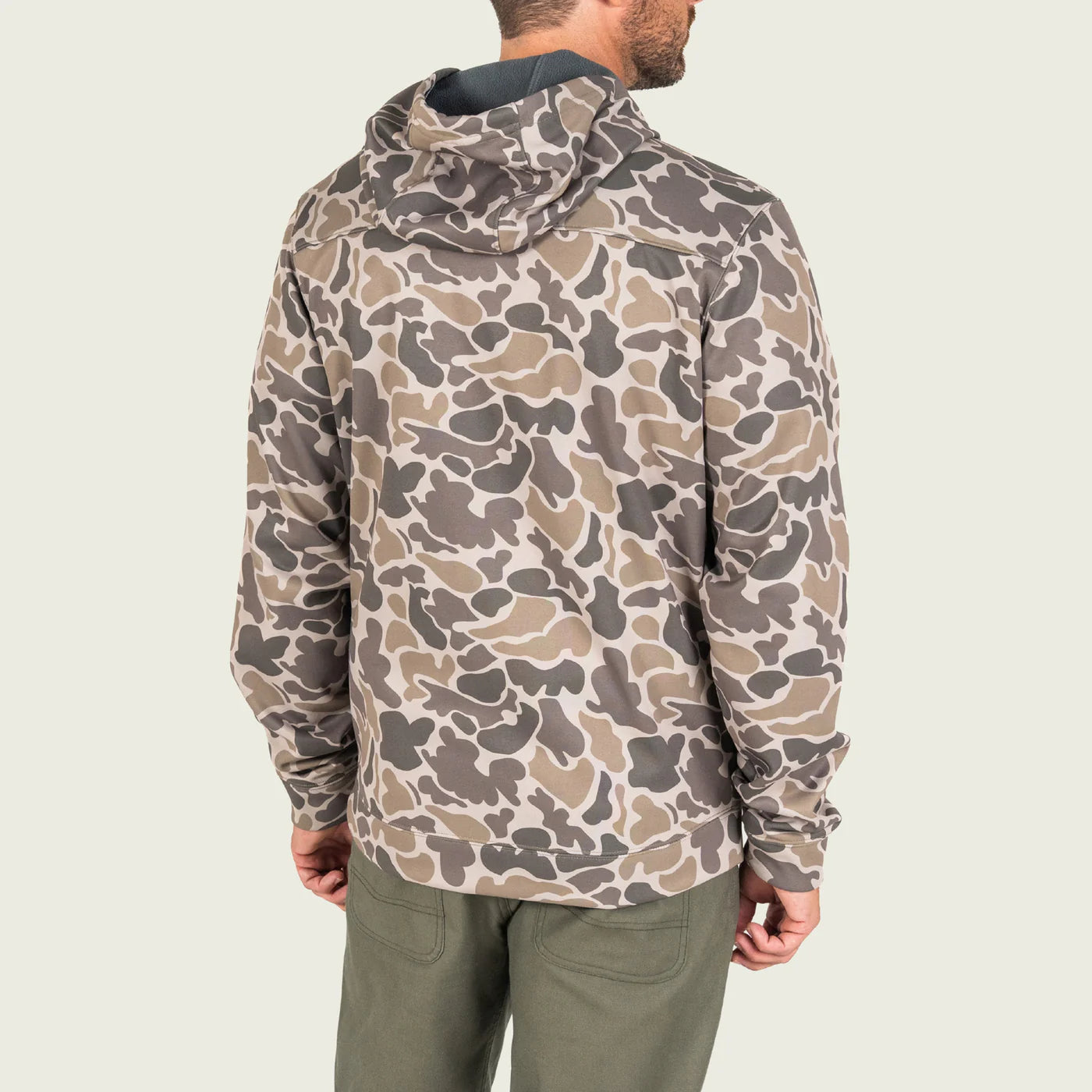 This hoodie is made of a unique bonded micro fleece fabric with a DWR finish that makes for the perfect layering piece for when the temps drop low and the perfect jacket to toss on for cold runs out to the flats or blind.