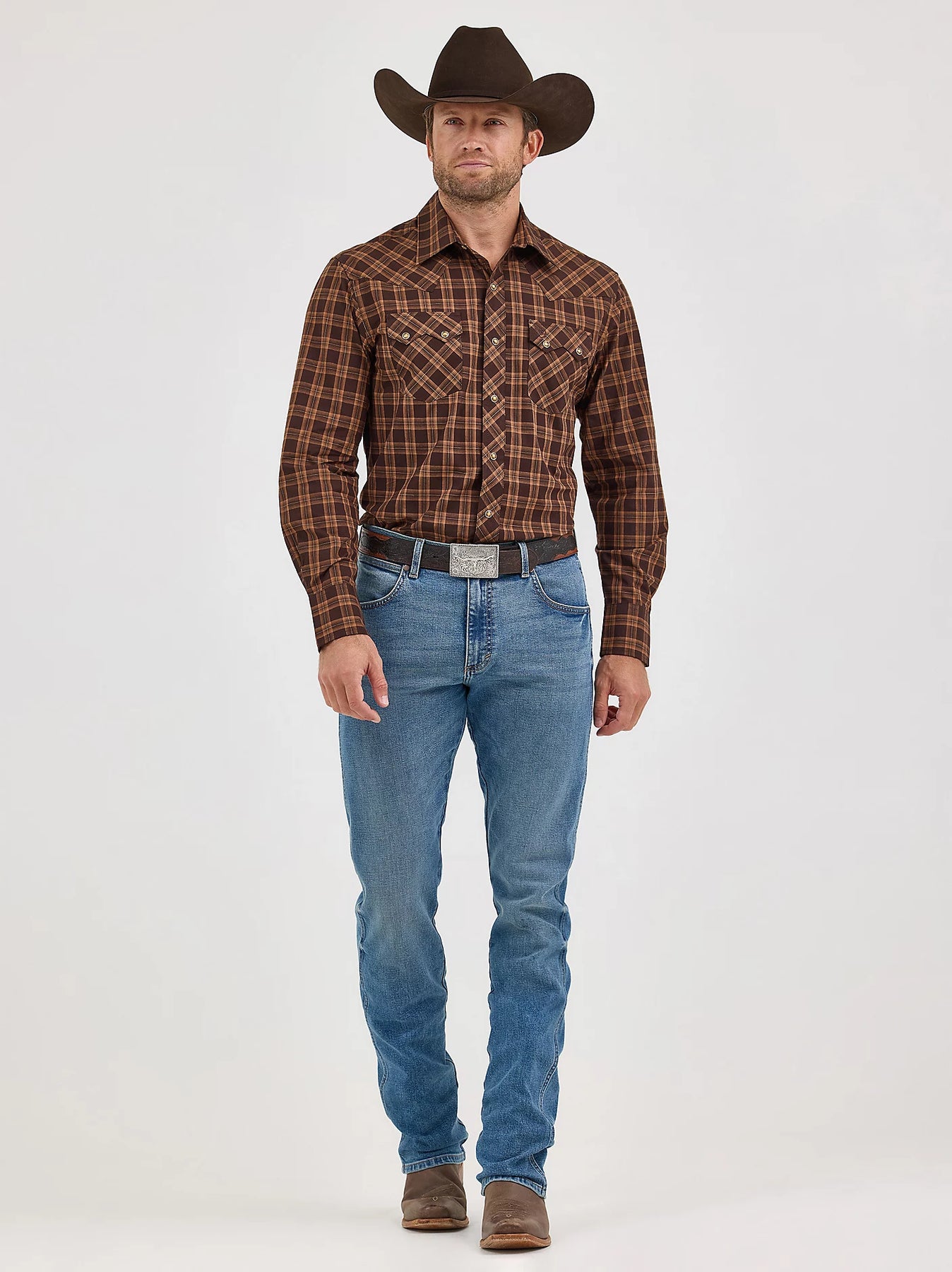 Paying tribute to our Western roots, the men's Wrangler Retro® long-sleeve sawtooth snap pocket western shirt gives the classic style you know a modern look and feel. It comes with all the same details you love, including a spread collar, pointed yokes, and two sawtooth snap flap pockets with embroidery to add a bold element to every outfit. Plus, it features a modern fit and it's crafted from cotton for comfort and long-lasting durability, no matter how often you wear it. Wear it with a pair of Wrangler Retro bootcut jeans to complete the look for any occasion.