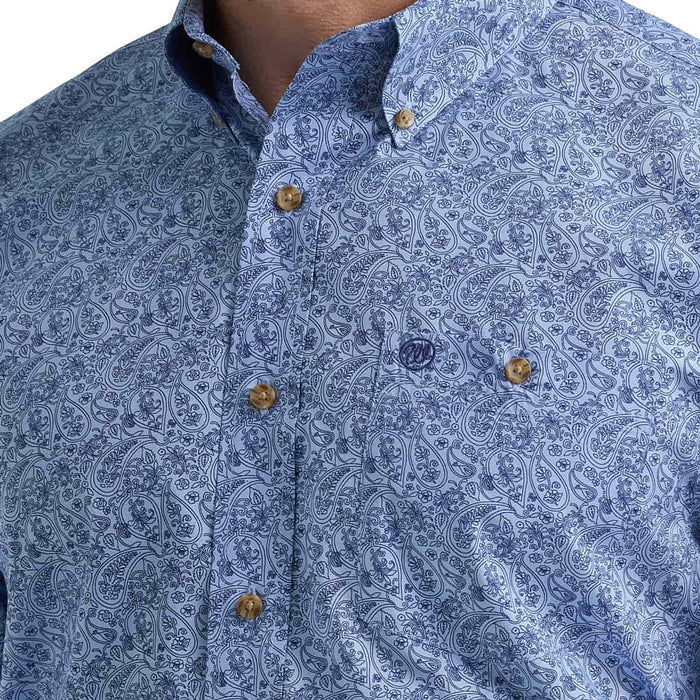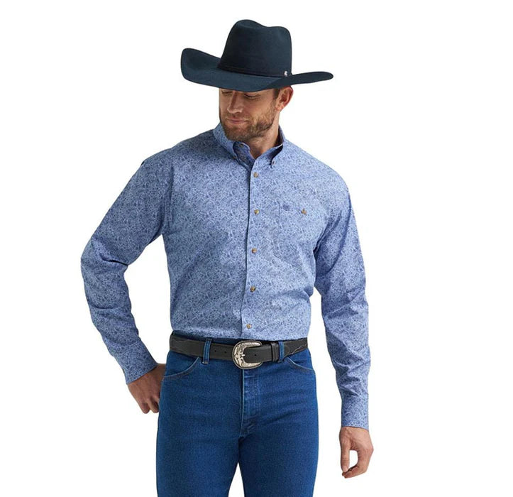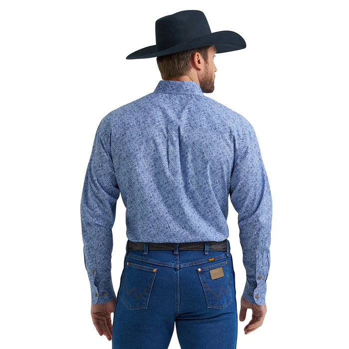 Elevate your everyday look with the Wrangler Men's Dark Blue Paisley Button Long Sleeve Shirt. Featuring a bold and stylish paisley print on a rich dark blue background, this shirt blends classic Western charm with modern flair. Crafted from a soft, durable cotton blend, it offers a comfortable fit and long-lasting wear. Details include a full button front, adjustable cuffs, and twin chest pockets with button flaps for added function and style.