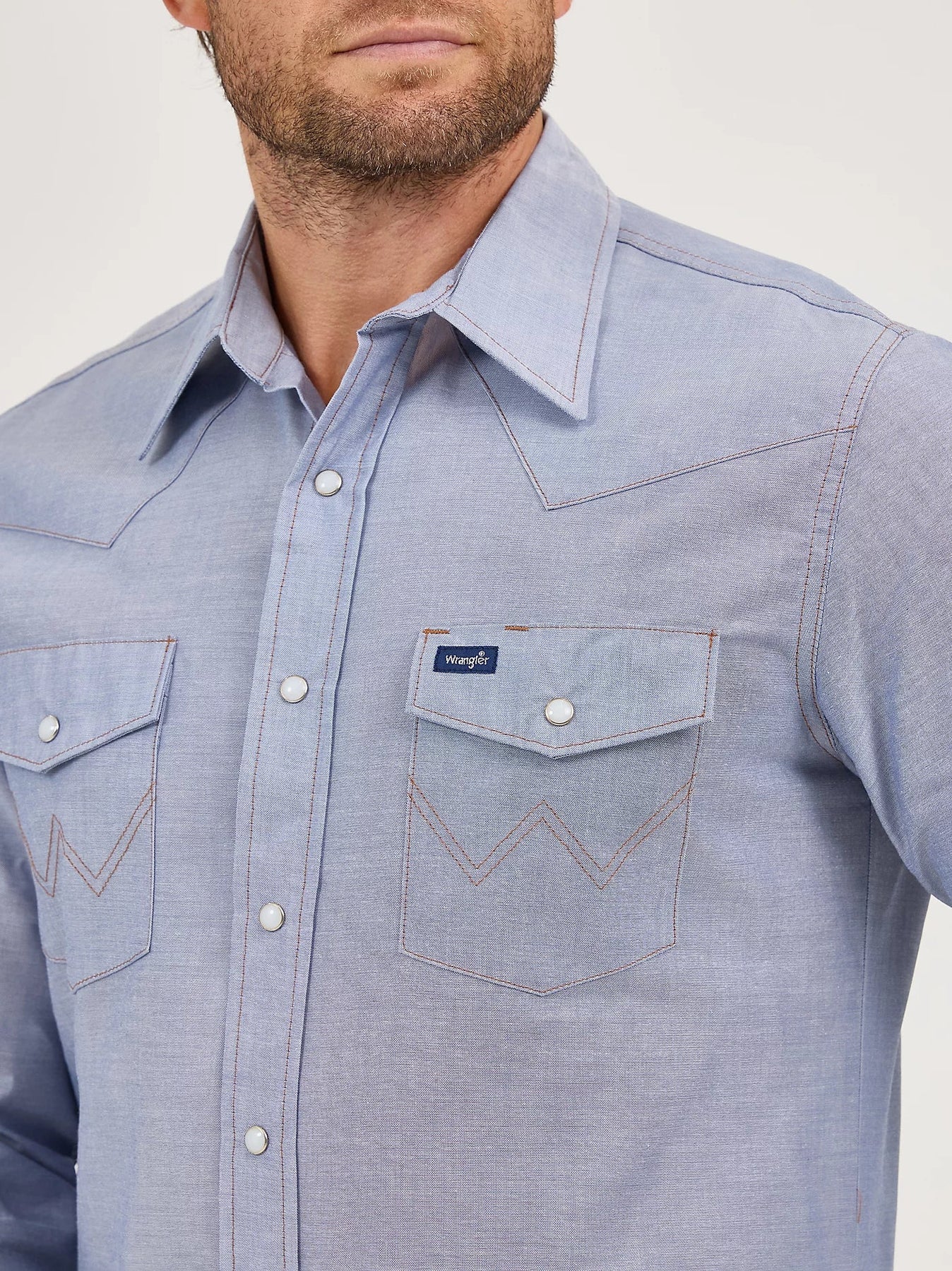 To tackle projects both on and off the job, you'll want a sturdy shirt that can handle everything you throw at it. Luckily, the Wrangler® Cowboy Cut® work shirt is a tried-and-true staple that performs from dawn until dusk. Our men's Cowboy Cut® rigid denim long sleeve shirt features a classic fit as well as a 100% cotton construction that's untouched, untreated, and unwashed. Plus, it comes with all the authentic Wrangler® details you know and trust, including Western front and back yokes, spade flap pockets with snap closures, and three-snap cuffs. Complete your look by pairing this Cowboy Cut® work Western rigid denim shirt with our Cowboy Cut® jeans.Long Live Cowboys®