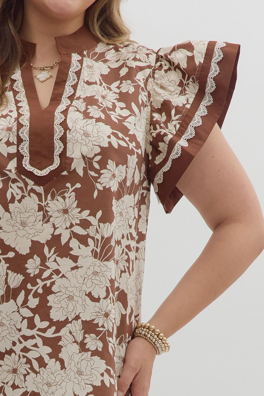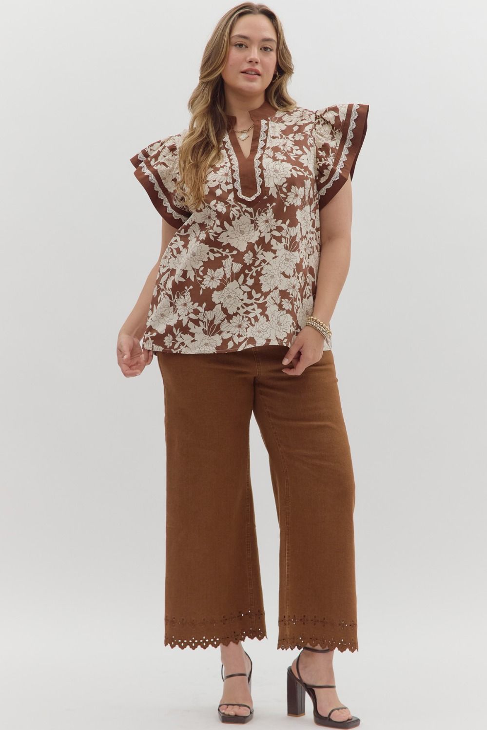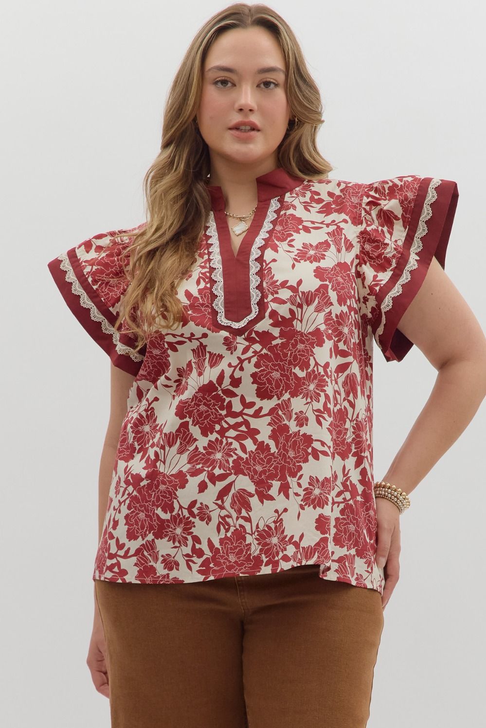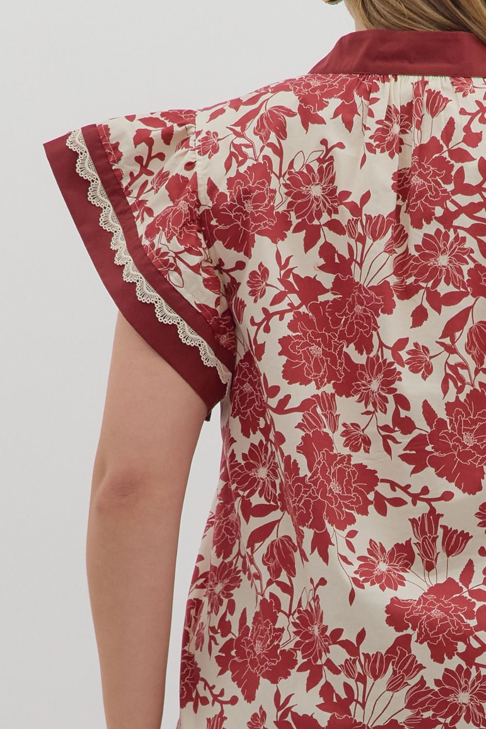 Floral print flutter sleeve top featuring contrast accent band with scallop lace trim inset. Unlined. Woven. Non-sheer. Lightweight.