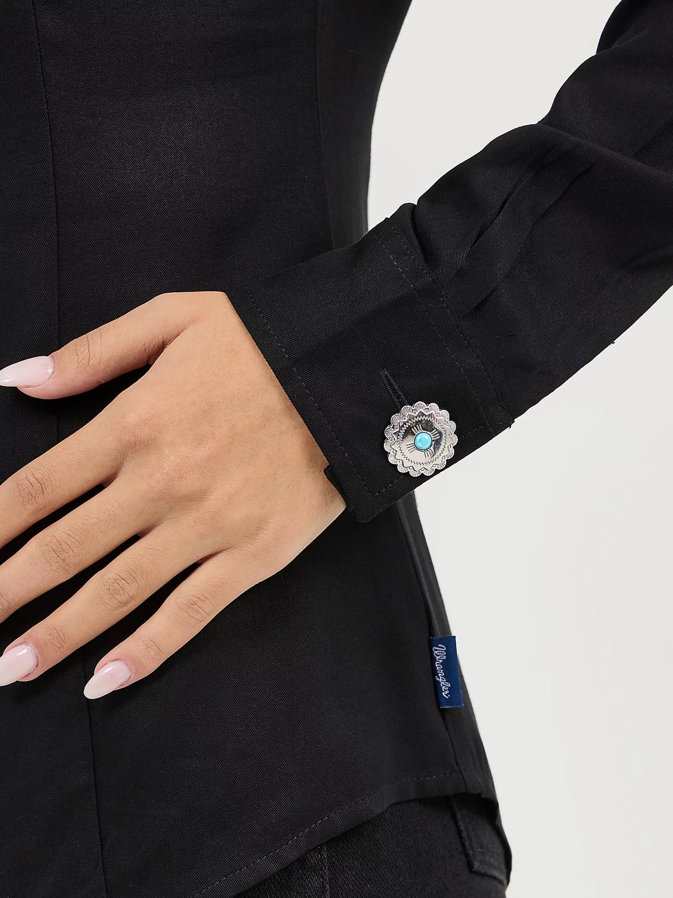 Who needs all those bells and whistles when you can have the most iconic statement piece? We’re talking conchos, and our Women’s Slim Concho Button Shirt does all the accessorizing for you. It’s crafted from a soft and silky fabric you’ll love wearing all year long. This iconic collared shirt comes with single-point yokes from front to back, a slimmed-down silhouette, and shiny concho buttons with turquoise-colored stone inserts. Tucked or untucked, this shirt will elevate every outfit.