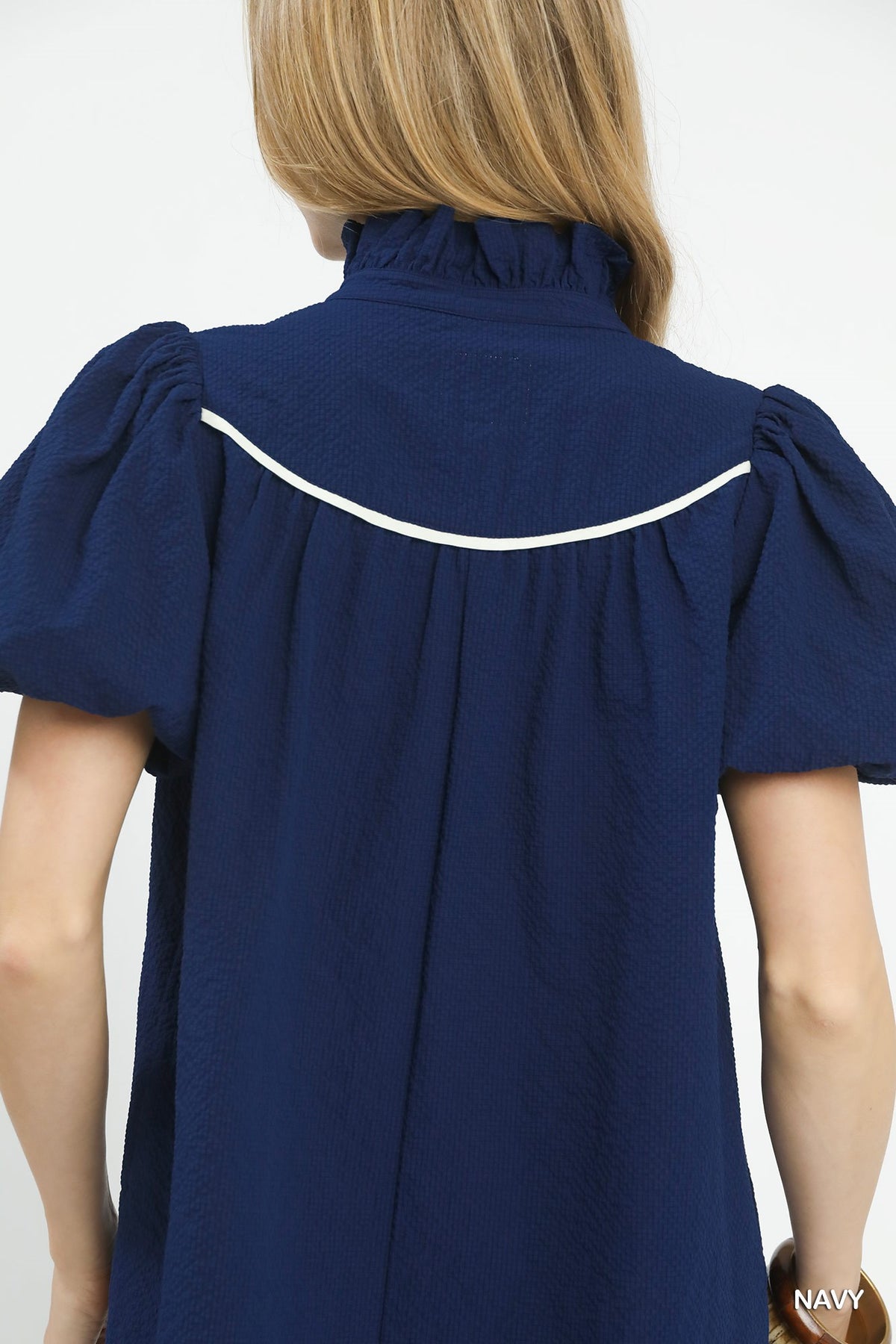 • Subtle ruffle stand collar