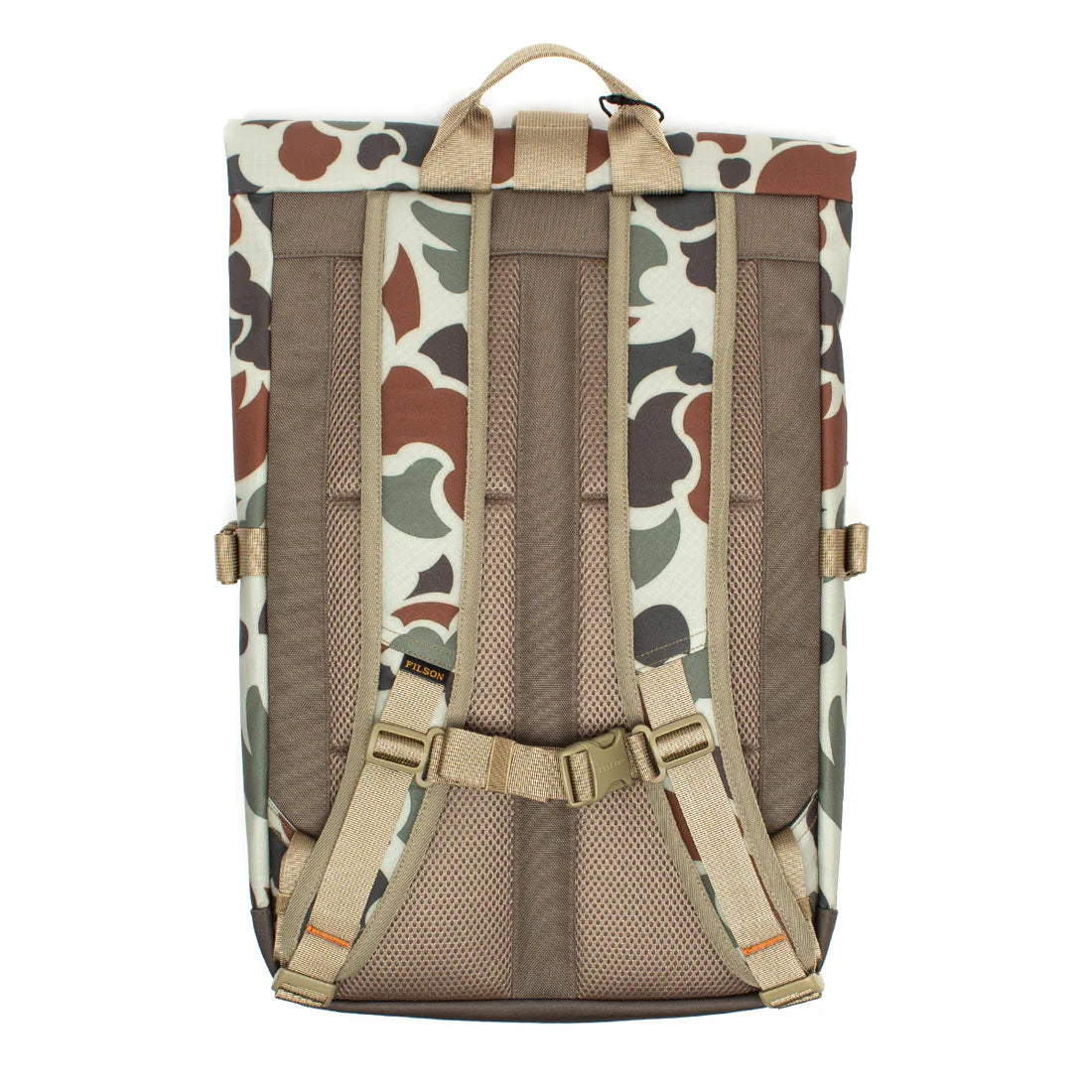 Buckling compression straps and roll-top closure