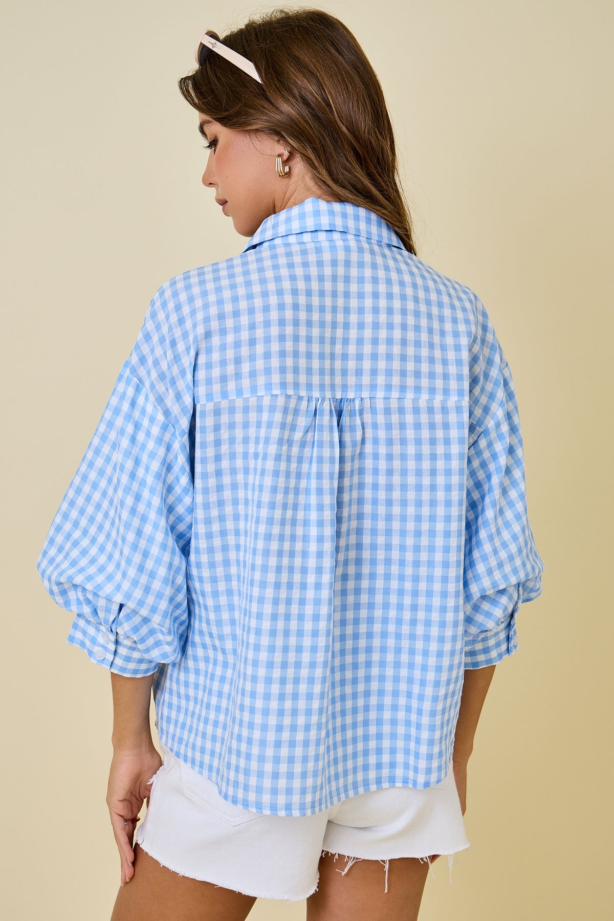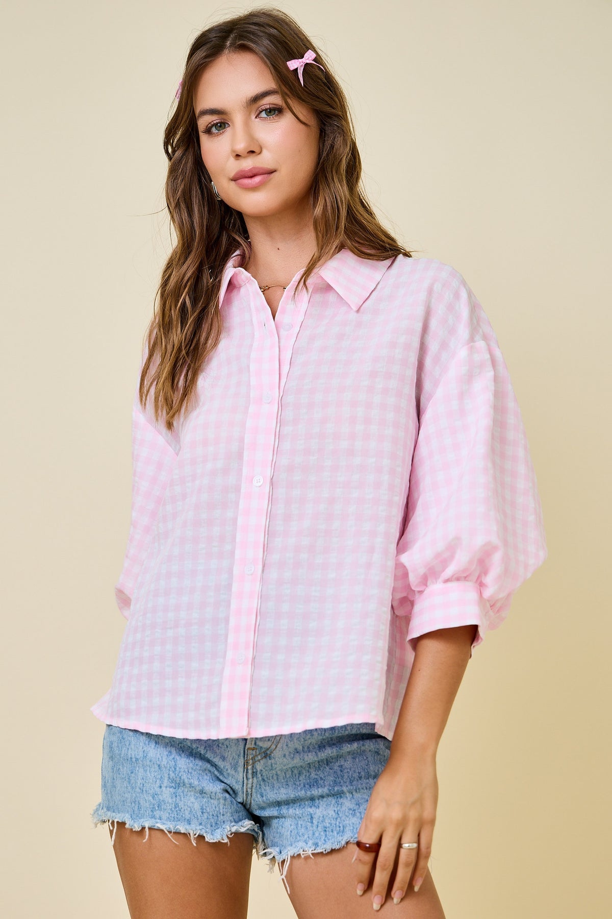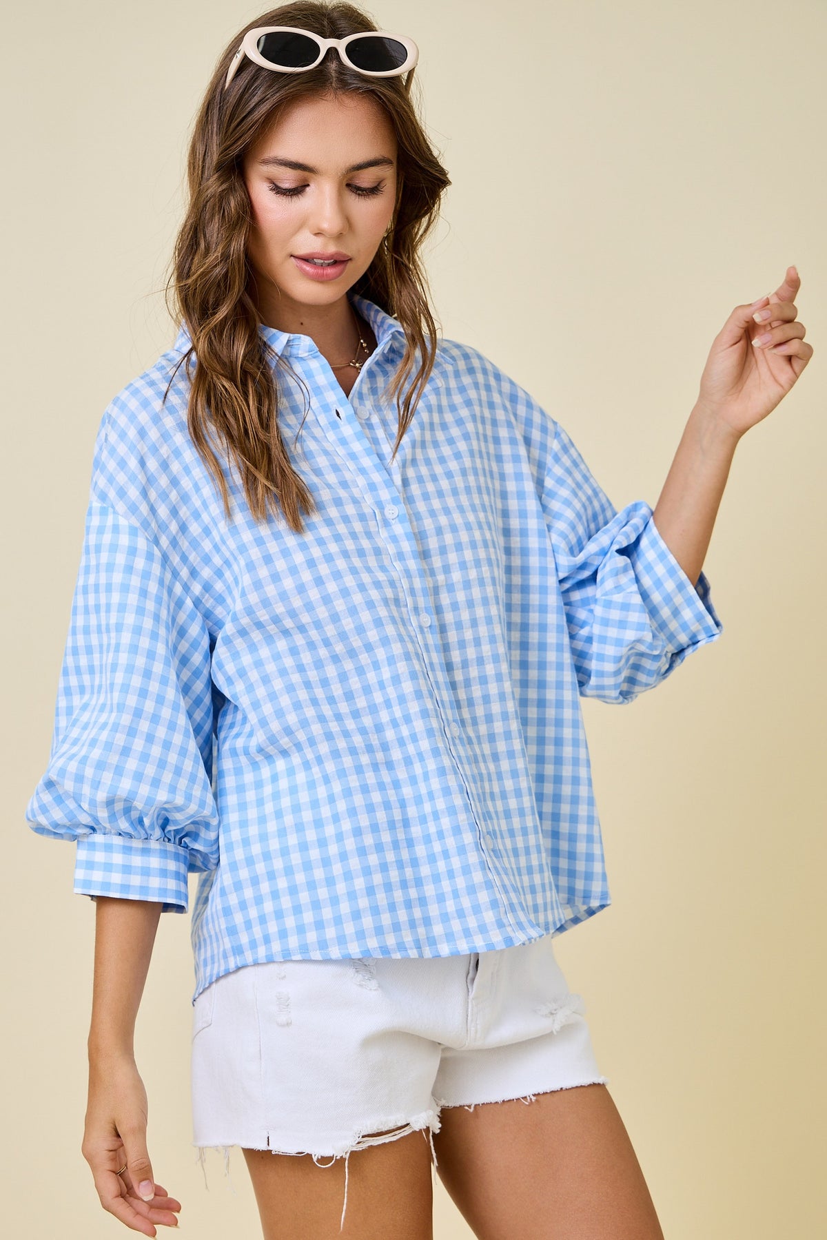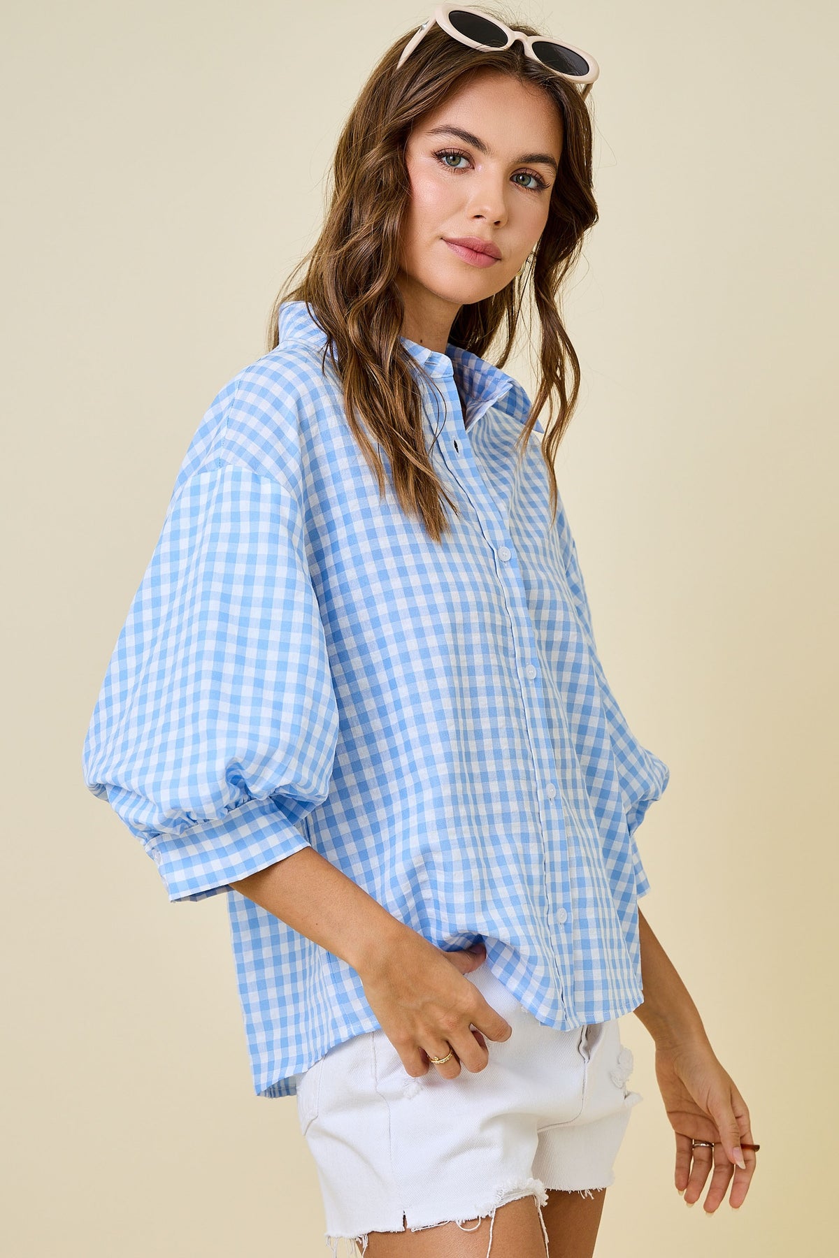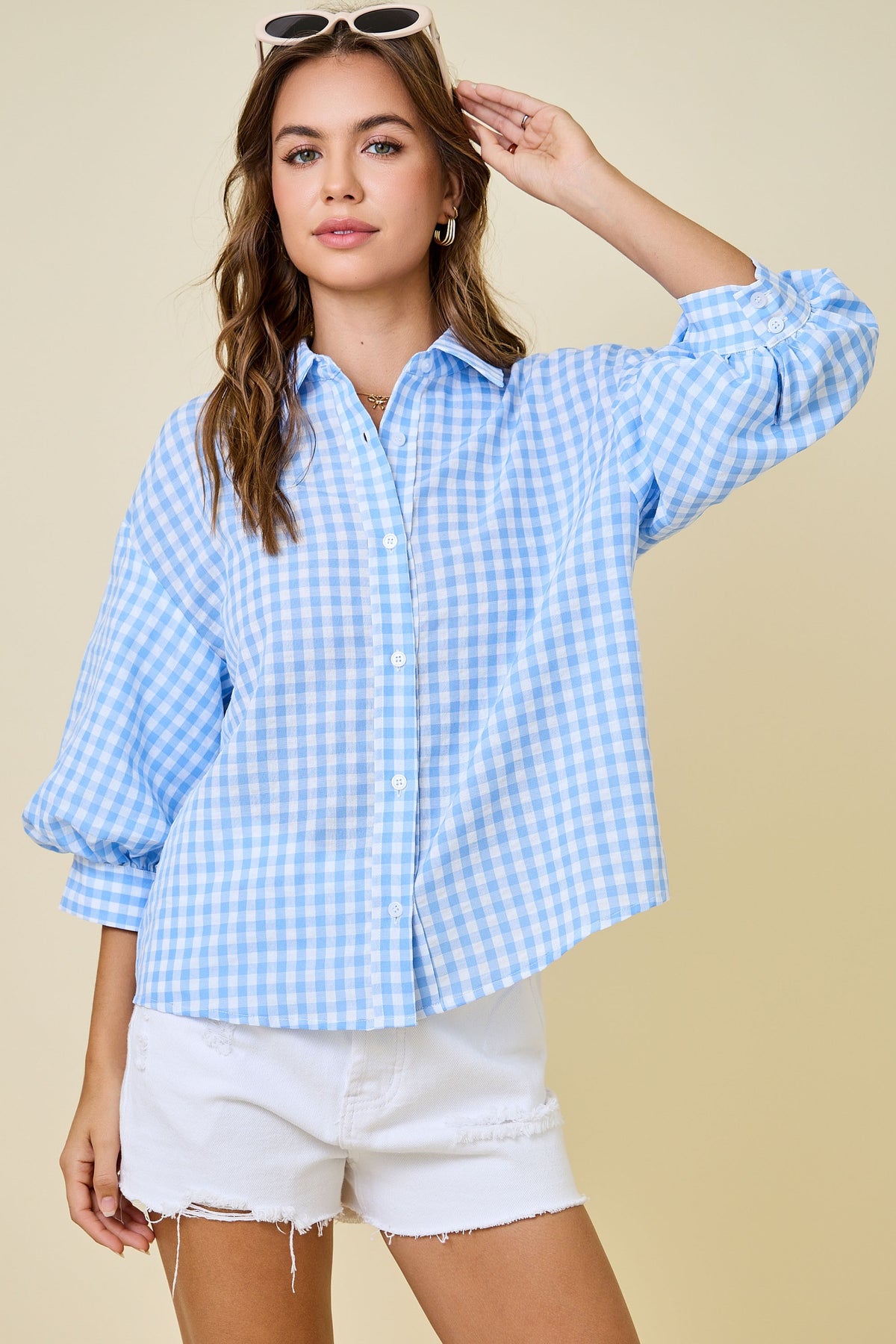 Gingham button down blouse with 3/4 bubble sleeve. Model is 5' !0" and wearing a size small.