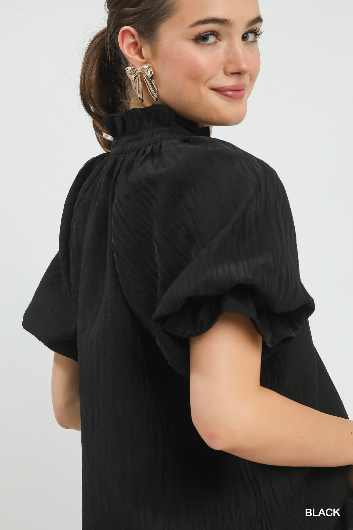 Textured Puff Sleeve Split Neck Top